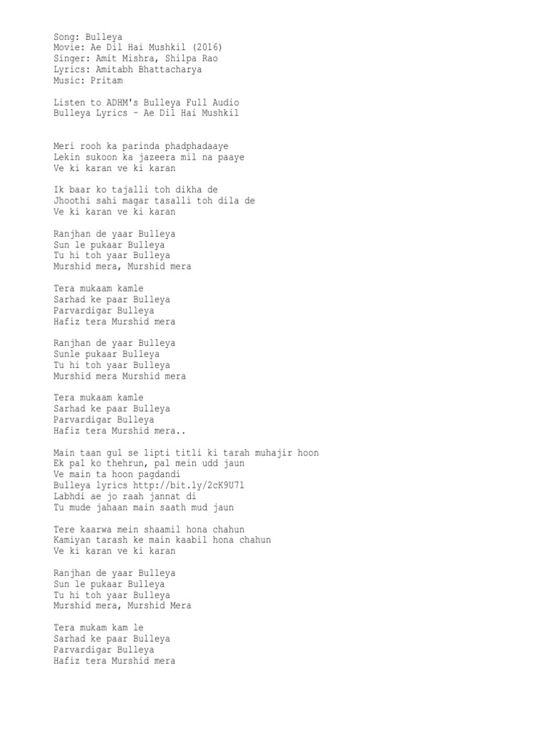 Bulleya English Lyrics Bulleya English Lyrics - Bulle nu log mati dende pooja bo maseeti vich maseetan ki kujh hunda je dilon namaz na neeti (x2).